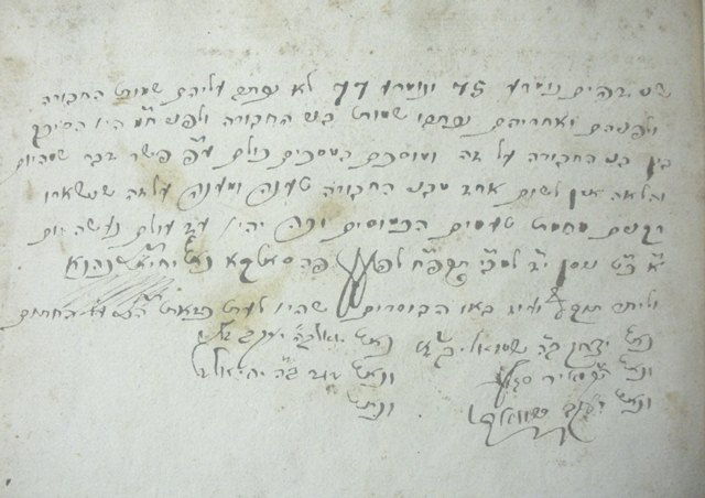 "שני דפים נומרע [=מס'] 75 ונומרע [=מס'] 77 לא נכתב עליהם שמות החבורה ולפניהם ואחריהם נכתבו שמות בני החבורה ולפני ח"מ היו הסיכך[?] בין בני החבורה על זה ומוסכם במסכים כולם ע"פ פשר דבר שמהיום והלאה אין לשום אחד מבני החבורה טענה ומענה על זה שנשארו ריקים מחמת טעמים הכמוסים וכה יהיו עד עולם. נעשה יום א' כ"ט ניסן י"ד למב"י תקפ"ח לפ"ק פה סאלקא נא' יחיאל כהנא...".